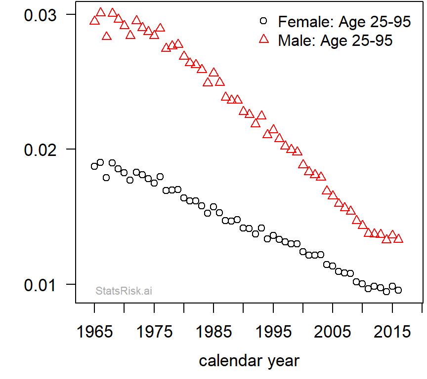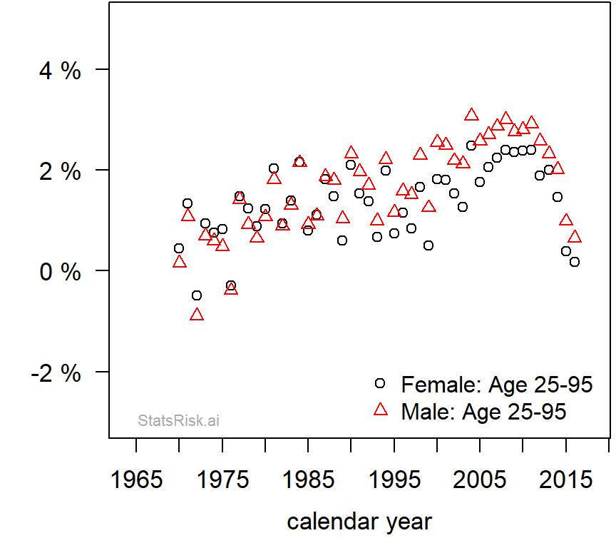 For example, they confirm the steady fall of mortality rates over time for men and women; in particular, male’s mortality rates have been falling faster than female’s (at least post-1980). Post-2010, the fall of mortality rates seem to have slowed down for both genders, and the trend has become almost at: we see this feature from both panels, noting, in the right hand panel, the dropping of the annual improvement rates down towards zero during the last five years of the time-period.